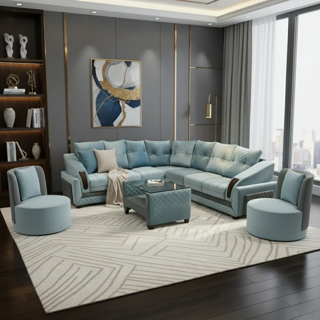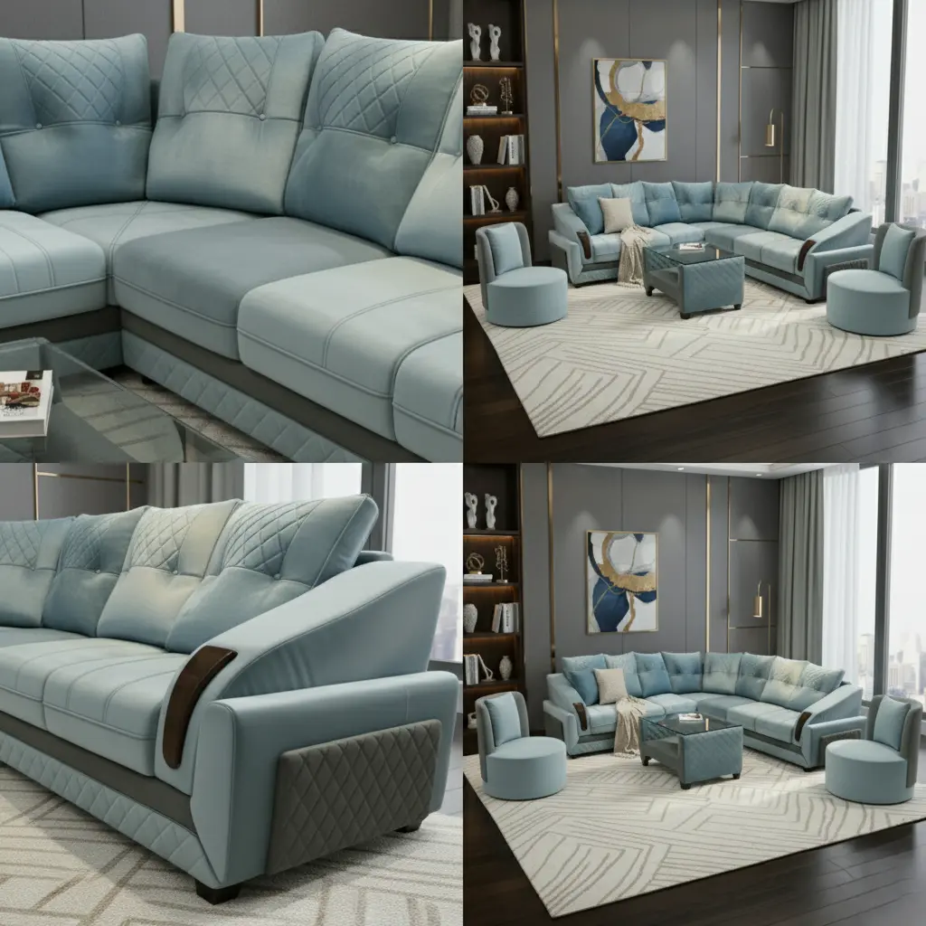 The Obli Lifa redefines modern elegance with its striking aqua upholstery and sophisticated diamond quilting. Its large L-shape design and generously cushioned seats provide supreme comfort and space for entertaining. The polished wooden armrest accents add a final touch of distinction. Choose the Lifa to create a serene, visually captivating sanctuary in your home, reflecting ObliHome’s dedication to bold, premium design.