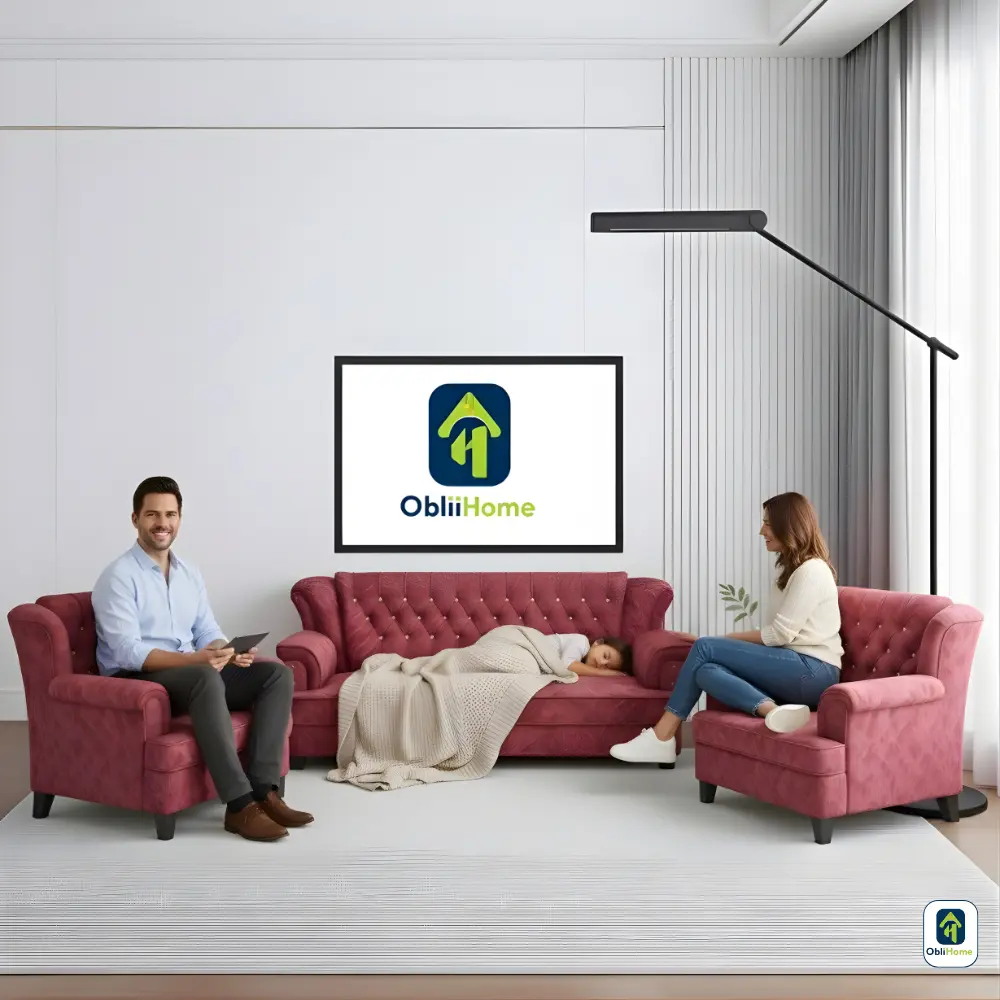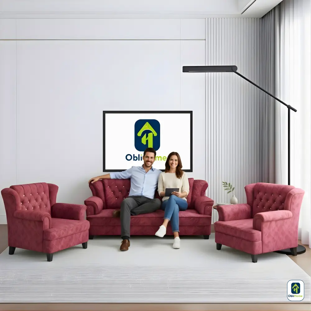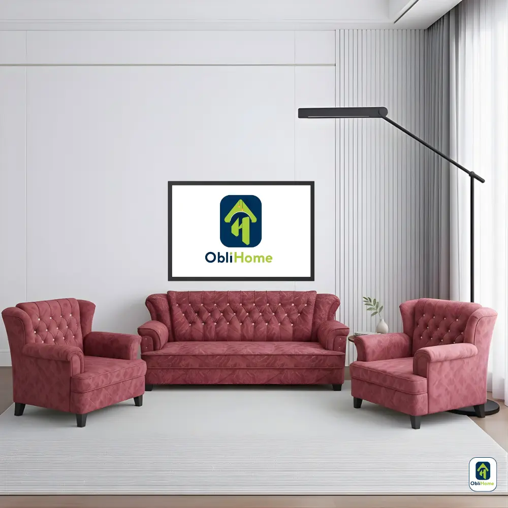 The Obli Rona set is a bold statement in classic design. Inspired by Queen Anne style, the sofa and armchairs feature deep, meticulous button tufting and graceful scrolled arms. Upholstered in a luxurious, textured deep pink fabric, this 3+1+1 group provides commanding presence and supportive comfort. Choose the Rona to infuse your home with traditional opulence and ObliHome’s enduring quality.